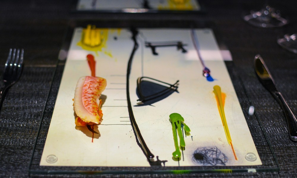 A print of Miro’s June 2, 1973 painting came to the table, instead of a plate. Immediately after, a glass plate was placed over it, with every food element matching the painting, making one of the most beautiful scenes I’ve ever seen.